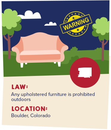 Couches, chairs, mattresses, chaise lounges—you name it. You cannot have any upholstered furniture, or any furniture not manufactured for outdoor use, in the yard or on the porch of your home in Boulder. The restriction was passed to curb the dangers of setting those things on fire. It is because local college students, who were known for their party atmosphere, would get drunk and had a habit of setting fires to the said couches. Since passing in Boulder, many other cities, such as Ames, Iowa, Lincoln, Nebraska, and Columbia, Missouri, decided to pass a similar law. Now, if you're looking to live the outdoor life of your dreams in any of these cities, you wouldn’t mind the hard chairs, would you?